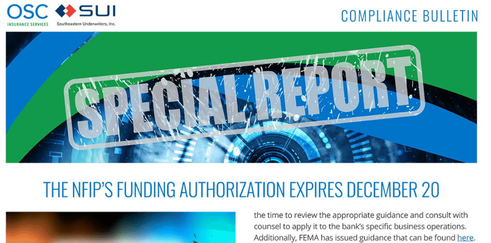 Chief Compliance Officer Kirk Stephens, CRCM, explains explains the implications of a lapse in funding for the NFIP. It also discusses how lenders can prepare themselves, and what SUI is doing to help protect our clients.
